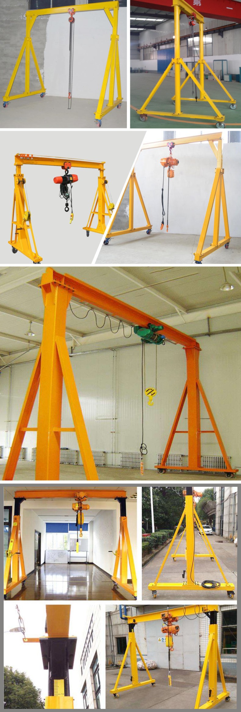Portable gantry cranes are designed for everyday use and are often used in the production, installation and maintenance of equipment requiring portability. Portable gantry cranes are a very economical crane for lifting materials in any field within a facility. For areas that are lifted infrequently, this crane can be more cost-effective than expensive permanent