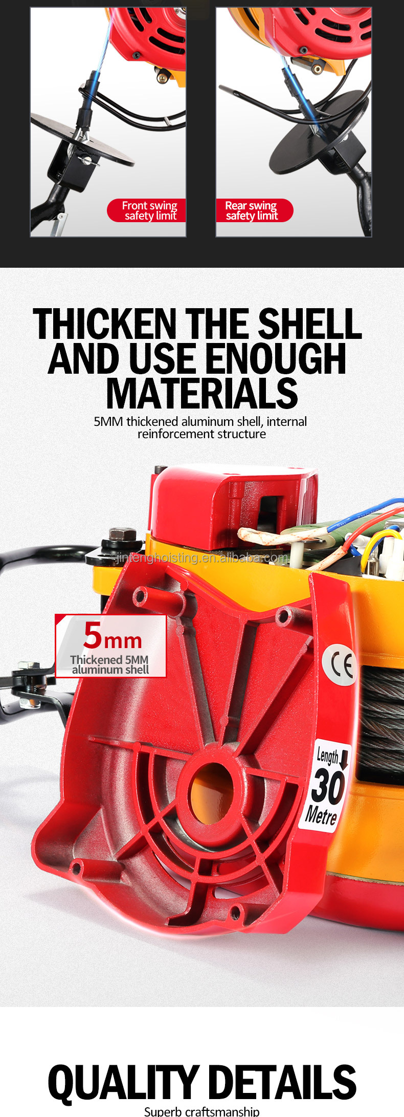 We use aluminum for this model, which is more durable.This electric hoist is very portable, weighing about 20 kg, and can be easily carried by an adult