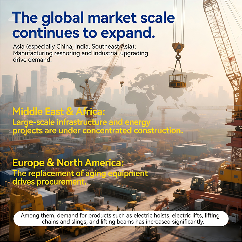 Products such as electric hoists, electric winches, wire rope hoists, chain slings, and lifting beams are seeing the fastest increase in global demand.