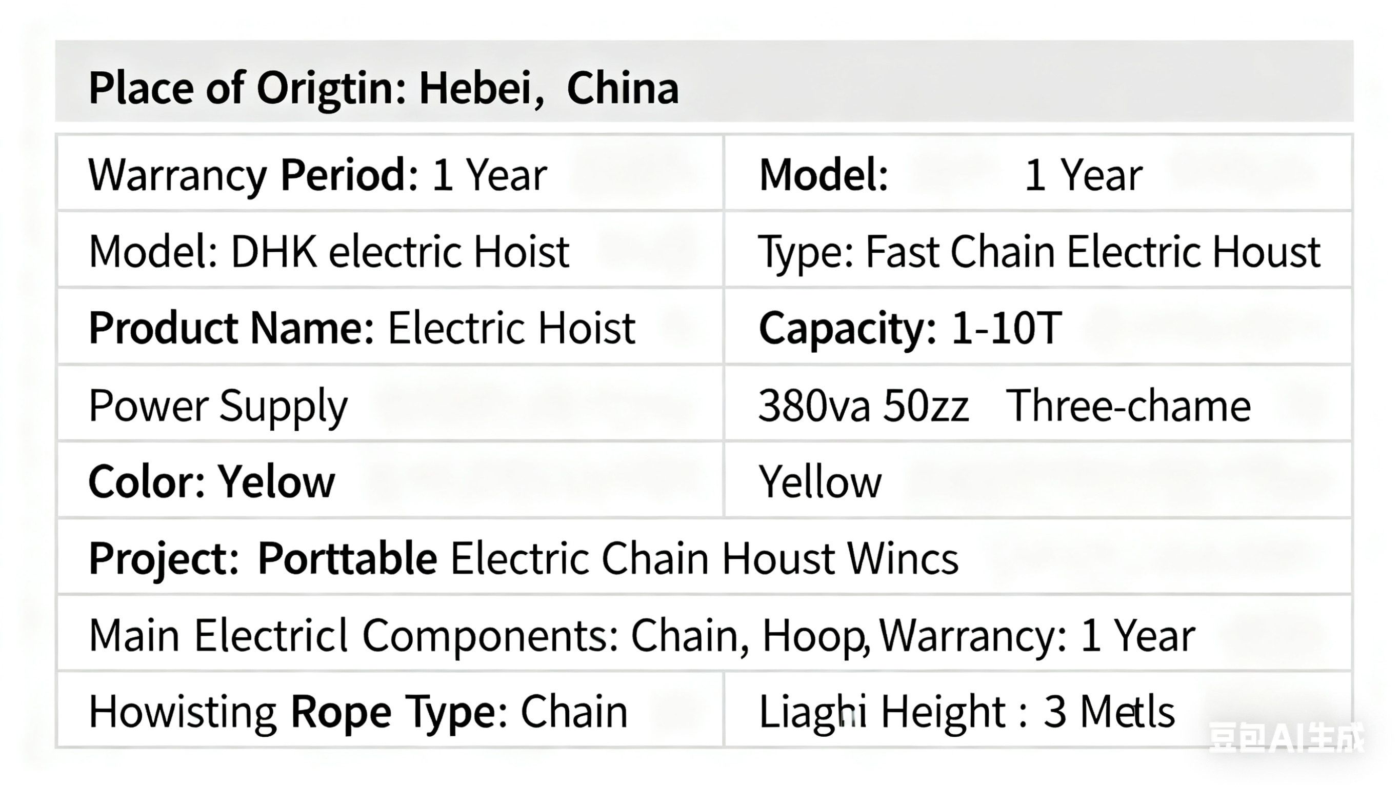 Vitesse de levage élevée: par rapport aux palans à chaîne électriques ordinaires, la série DHK offre des vitesses de levage et d’abaissement plus rapides. Par exemple, le modèle de 5 tonnes peut atteindre une vitesse de levage de 2 m/min, améliorant considérablement l’efficacité du travail et réduisant le temps de fonctionnement.